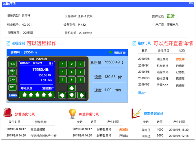 設(shè)備臺賬:設(shè)備臺賬記錄設(shè)備全生命周期管理,從設(shè)備登記、安裝日期、設(shè)備技術(shù)參數(shù)、稱重標準值、校準記錄、告警日志、監(jiān)控趨勢等信息。