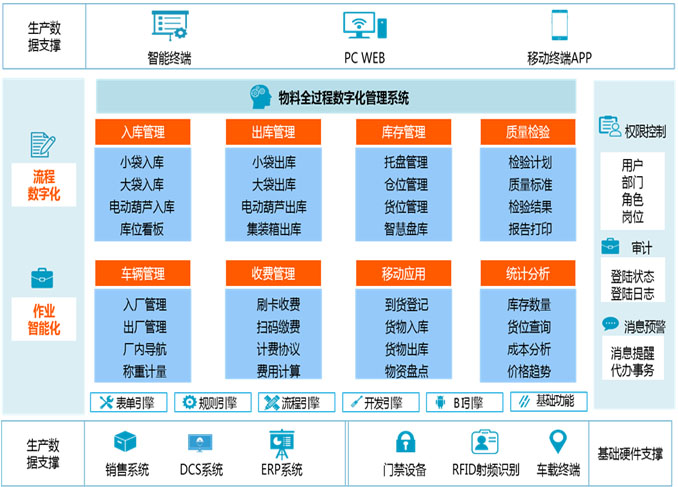 物料全過(guò)程數(shù)字化管理系統(tǒng),應(yīng)用人工智能、RRID射頻識(shí)別、移動(dòng)應(yīng)用等先進(jìn)技術(shù),對(duì)物料作業(yè)流程進(jìn)行全過(guò)程閉環(huán)管控,使信息流、物流、車流、資金流保持一致,實(shí)現(xiàn)物料入庫(kù)、出庫(kù)、庫(kù)存的高效管理,實(shí)現(xiàn)作業(yè)流程智能化。